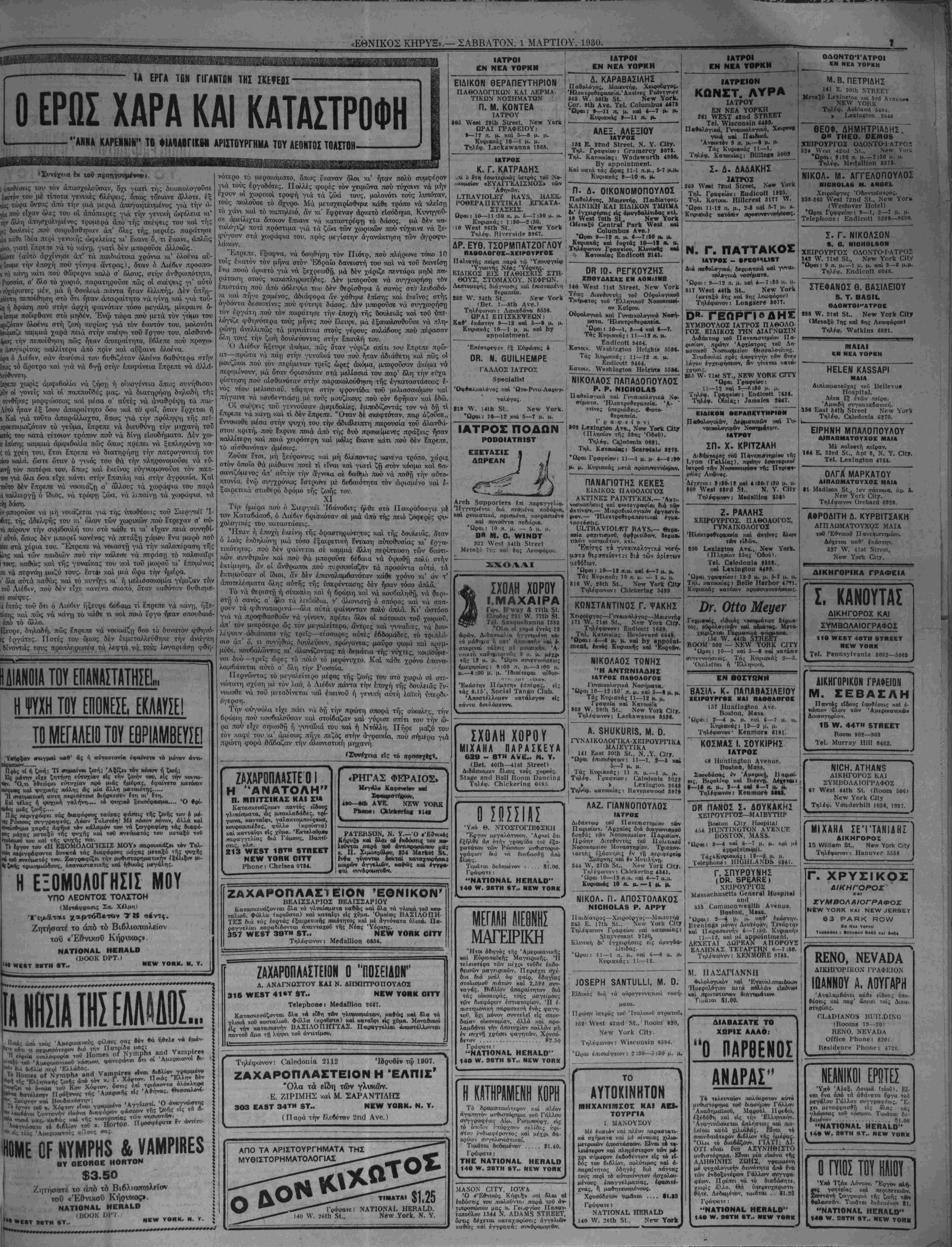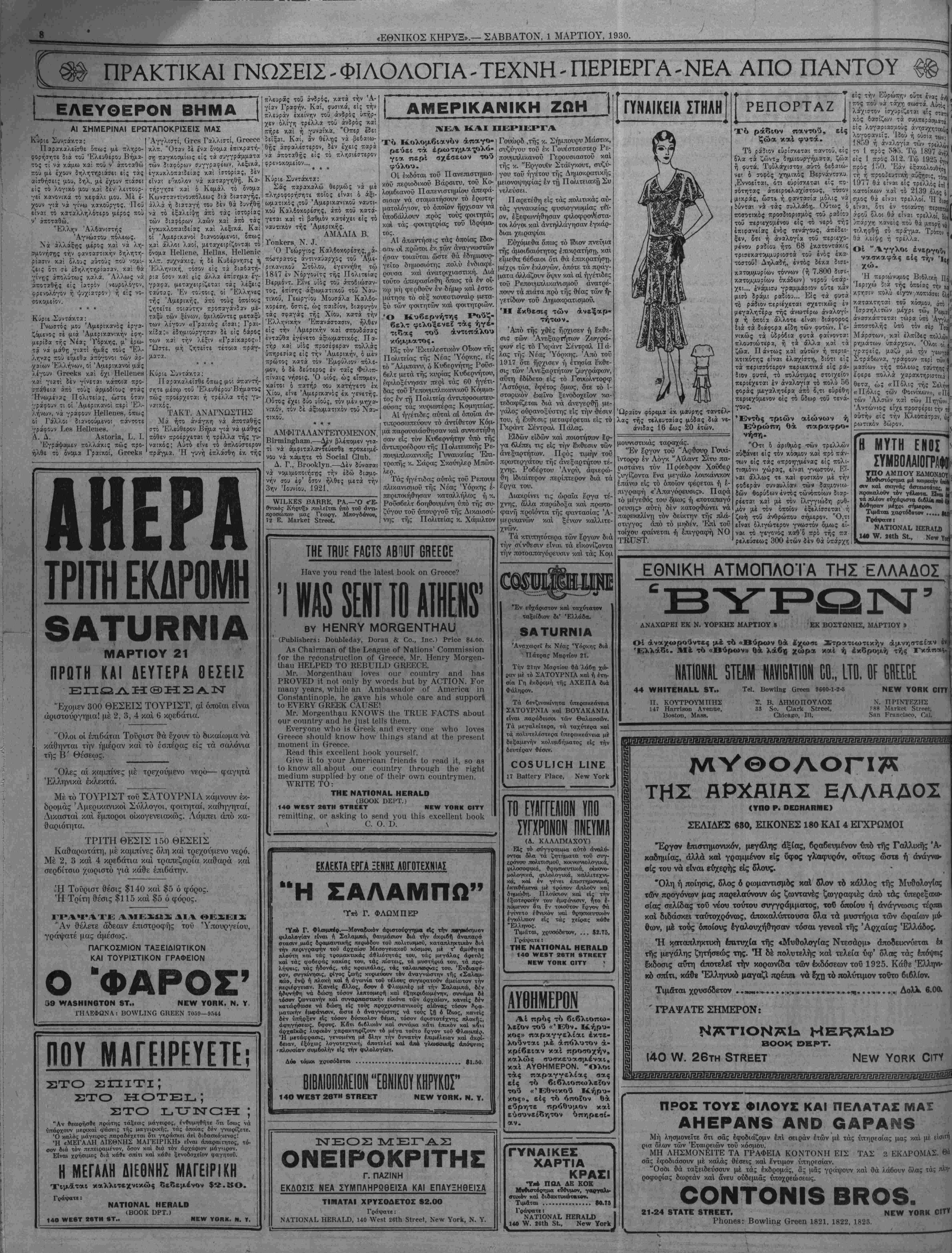 καλώς <ΐυακβυααμ£ναι, καί ΑΥΘΗΜΕΡΟΝ. "Ολοι τας παραγγελίας σας είς τό βιβλιοπωλείον τού «Έθνικου Κήρυ- κος», είς τό οποίον θά εΰρητε πρόθυμον κ αί ευσυνείδητον υπηρεσί¬ αν. ΑΡΧΑΙΑΧ <ΥΠΟ Ρ. ΟΕΟΗΑΗΜΕ) ΣΕΛΙΔΕΣ 680, ΕΙΚΟΝΕΣ 180 ΚΑΙ 4 ΕΓΧΡΩΜΟΙ "Εργον ^οτημονικον, μβγάλης άξίας, 6ρα6ευμένον Όπ6 τής Γαλλικής Ά· καδημίας, άλλά καί γραμμένον είς ΰφος γλαφυρόν, ούτως ώστβ ή άνάγνο σίς τού νά είναι ευχερής είς δλους. "Ολη ή ποίησις, δλος 6 οωμαντισμδς καί δ7.ον τ5 κάλλος τής ΜυθολογΙας τ65ν προγόνων μας παρελαύνουν ώς ζωντανές ζωγραφιές άπό τάς ΰπερεξακο- σίας σελίδας τοϋ νέον τούτου συγγράμματος, τοΰ δποίου ή άνάγνωσις τέρπβι καί διδάσκει ταυτοχρόνως, άποκαλύπτουσα δλα τα μυστήρια των ώραίων μύ· θων, μέ τούς όποίους έγαλουχήθησαν τόσαι γενεαΐ της Αρχαί άς Ελλάδος. Ή καταπληκτική έπιτυχία ττ)ς «Μυθολογίας Ντεσάρμ» άποδεικνύεται έχ τής μεγάλης ζητήσεώς της. Ή δέ πολυτελής καί τελεία υφ' όλας τάς έπσψεις &ίδοσις αυτή αποτελεί την κορωνίδα τών έκδόσεωντοΰ 1925. Κάθε Έλλττνν κό σπίτι, κάθβ Έλληνικό μαγαζΐ πρέπει νά έχη τό πολύτιμον τουτο βιβλίον. Τιμαται χρυσόδετον ..»—.^.... .-.·.,. .,...., Μ.. .-...,... .ιΦ) Δολλ. 6.00. ' ΓΡΑΨΑΤΕ ΣΗΜΕΡΟΝ: 140 ΒΟΟΚ 1-ΚΡΤ. 26τη 3ΤΚΕΕΤ ΝΕνν ΥθΡΚ ΟΐΤΥ ΓΥΝΑΙΚΕΣ ΧΑΡΤΙΑ ΚΡΑΣΙ •Υπ* ΠΟΑ ΑΕ ΚΟΚ Μνθι—όρημβ ΐβθνμον, γαογαλ»- —ικόν καί διδαχττχώτ«τβν. Τιμαται ............... «0.75 Γράψατε ι ΝΑΤIΟΝΑ^ ΗΕΗΛίϋ 140 νΥ. ίθΐη 51., Νβιν Υογκ ΤΟΥΣ ΦΙΛΟΥΕ ΚΑΙ ΠΕΛΑΤΑΣ ΜΑΣ ΑΗΕΡΑΙΜδ ΑΝΟ βΑΡΑΝδ Μη λησμονείτε δτι σάς έφοδιάζομν επί σειράν έτών μέ τάς υπηρεσίας μας καί μέ είσιτή ρια δλων τών Έταιρειών τοΰ κόσμου. ΜΗ ΛΗΣΜΟΝΕΙΤΕ ΤΑ ΓΡΑΦΕΙΑ ΚΟΝΤΟΝΗ ΕΙΣ ΤΑΣ ?, ΕΚΔΡΟΜΑΣ. θο δά έ λά θέ ί Ι ί ΜΗ ΛΗΣΜΟΝΕΙΤΕ ΤΑ ΓΡΑΦΕΙΑ ΚΟΝΤΟΝΗ σάς έφοδιάσουν μέ καλάς θέσεις καί Ιντιμον υπηρεσίαν. "Οσόι θά ταξειδεΰσουν μέ τάς έκδρομάς, άς μάς γράψουν καί θά λάβουν όλας τάς πλη¬ ροφορίας δωρεάν καί άνευ ούδεμιάς υποχρεώσεως. ΟΟΝΤΟΝΙ8 ΒΡΟδ. 21-24 8ΤΑΤΕ 8ΤΗΕΕΤ. Ρΐιοηββ: Βοννΐϊη^ ΟΓβοη 1821, 1822, 1823. ΥΟΗΚ