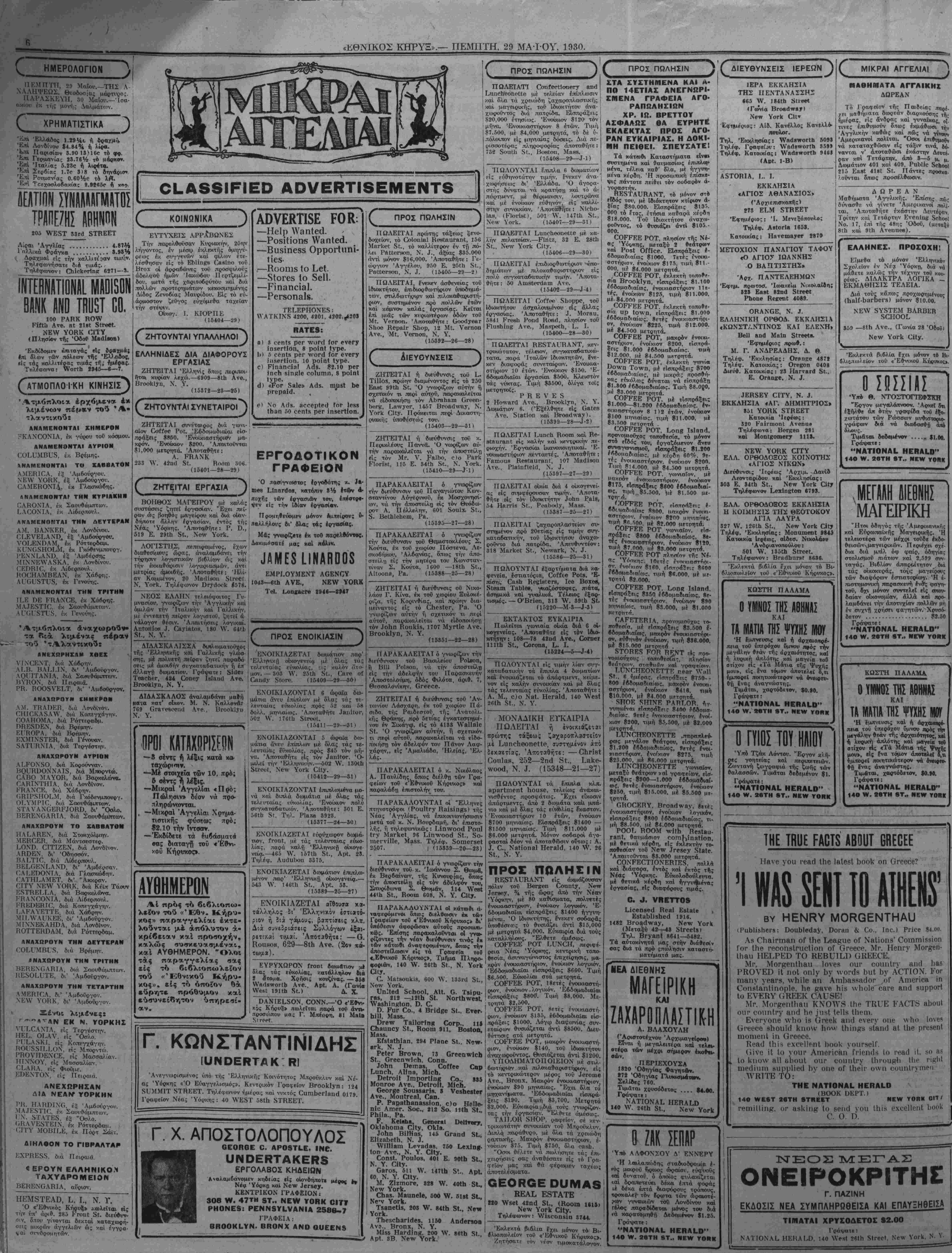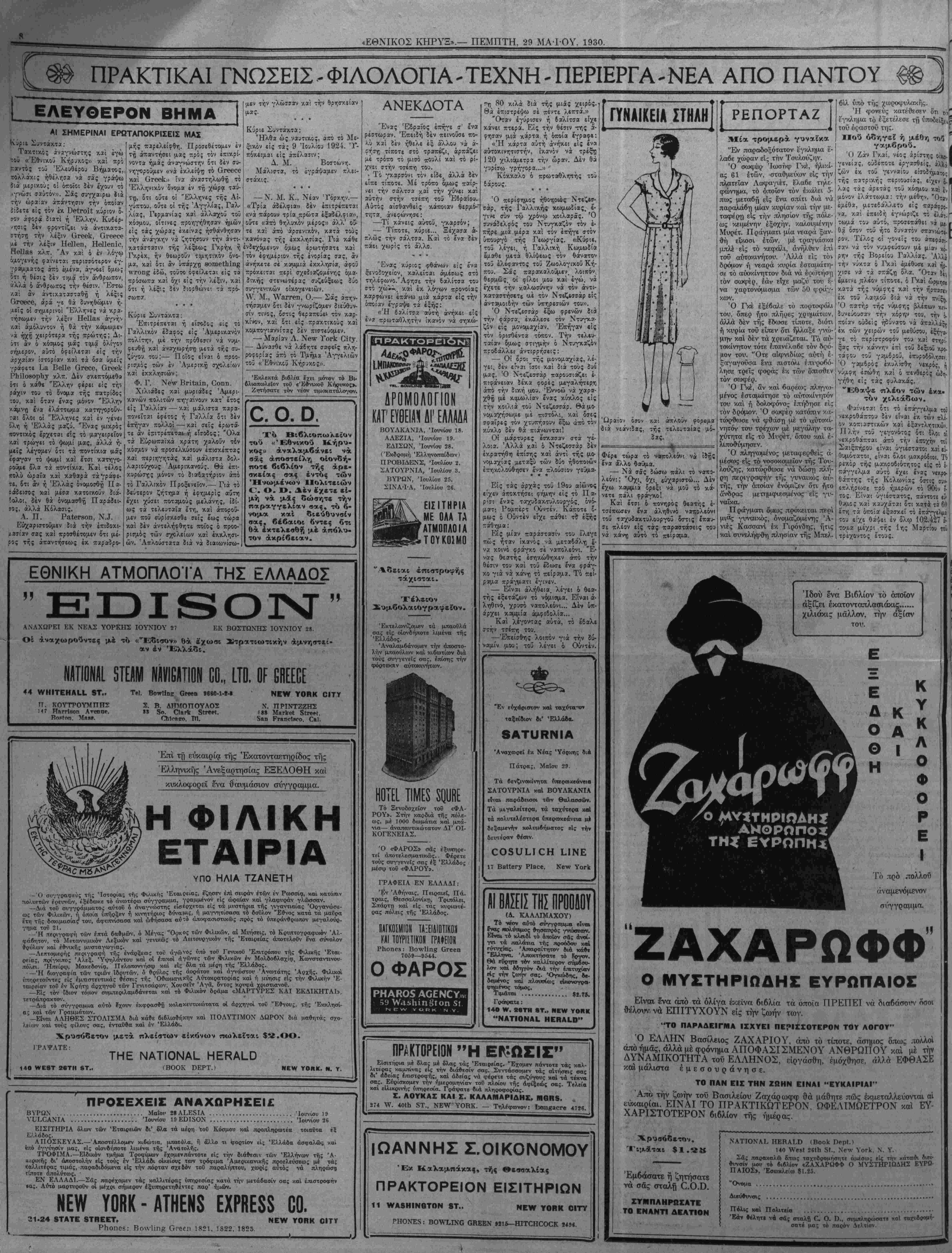 τος. Είναι ϋγιέ—ατος, πάντοτι ιϋ< θυαος καί καυχάται δτι κατά τα 60 έ'τη· τα όποία1 έξασκεί τό επάγγιλμ» τού ίί-/ε «άψε. έν δλφ 102.427 Ι το·.χα μέχρι^τής 1ης Μαρτίι» τρέχβντ&ς ετους. το'. Ιδού &να Βιβλίον τό οποίον άξίζει έκατονταπλασιάκις...... χιλιάκις μάλλον, την αξίαν Ε Δ Κ Ο Α Η Κ Υ Κ Λ Ο Φ Ό Ρ Ε Ι Τί) πρό πθλλθΰ άναμε·όμ£νον σνγγραμμα. ΖΑΧΑΡΩΦΦ Ο ΜΥΣΤΗΡΙΟΔΗΣ ΕΥΡΩΠΑΙΟΣ ΐ ενα άπό τα ολίγα έκεϊνα βιδλία τα όποία ΠΡΕΠΕΙ νά διαδάσοιη' οσοι θέλουν-νά ΕΠΙΤΥΧΟΥΝ είς την ζωήν των. "ΤΟ ΠΑΡΑΔΕΙΓΜΑ ΙΣΧΥΕΙ ΠΕ?ΐίΐΟΤΕΡΟΝ ΤΟΥ ΑΟΓΟΥ" Ό ΕΛΛΗΝ Βασίλειος ΖΑΧΑΡΙΟΥ, άπό τό τίποτε, ά'σημος όπως Λθλλα άπό ημάς, άλλά μέ φρόνημα ΑΠΟΦΑΣΙΣΜΕΝΟΥ ΑΝΘΡΩΠΟΥ και μέ την ΔΥΝΑΜΙΚΟΤΗΤΑ τοϋ ΕΛΛΗΝΟΣ, εΐργάσθη. έμόχθησε, άλλά ΕΦΘΑΣΕ καί μάλιστα έμεσουράνησε. ΤΟ ΠΑΝ ΕΙΣ ΤΗΝ ΖΩΗΝ ΕΙΝΑΙ "ΕΥΚΑΙΡΙΑΓ' Απο την ζωήν τοϋ Βασιλείου Ζαχάρωφφ θά μάθητε πώς έκμεταλλεύοηαι αί εύκαιρίαι. ΕΙΝΑΙ ΤΟ ΠΡΑΚΤΙΚΩΤΕΡΟΝ. ΩΦΕΛΙΜΩΕΤΡΟΝ καί ΕΥ- ΧΑΡΙΣΤΟΤΕΡΟΝ βιβλίον τής ημέρας. Τιμάται Έμβάσατε ή ζητησαχε νά σάς σταλίί Ο-Ο.ϋ. ΣΥΜΠΛΗΡΩΣΑΤΕ ΤΟ ΕΝΑΝΤΙ ΔΕΛΤΙΟΝ (Βοοίί 140 ΛΥββΙ 261η 5».. Νβν,· Υογ1{. Ν. Υ. —άς παρακαλώ δπως ταχυβρομησητε άμέσως βΐς την κάτωθι δι«ν· θΐΛτσίν μου τό βιβλίον «ΖΑΧΑΡΩΦΦ Ο ΜΥΣΤΗΡΙΩΔΗΣ ΕΥΡΟ- ΠΑΙΟΣ>. Έοωκλειω $1.25.