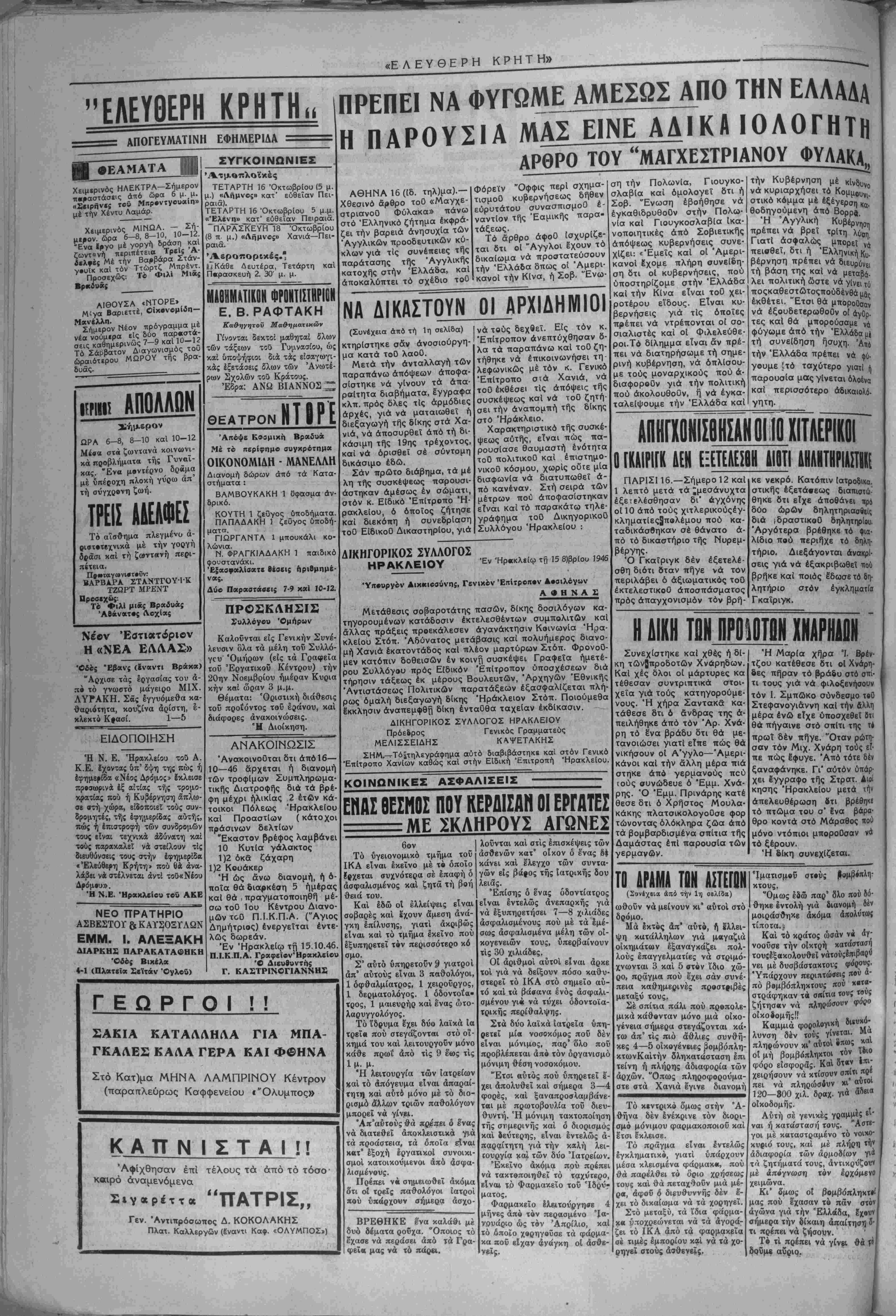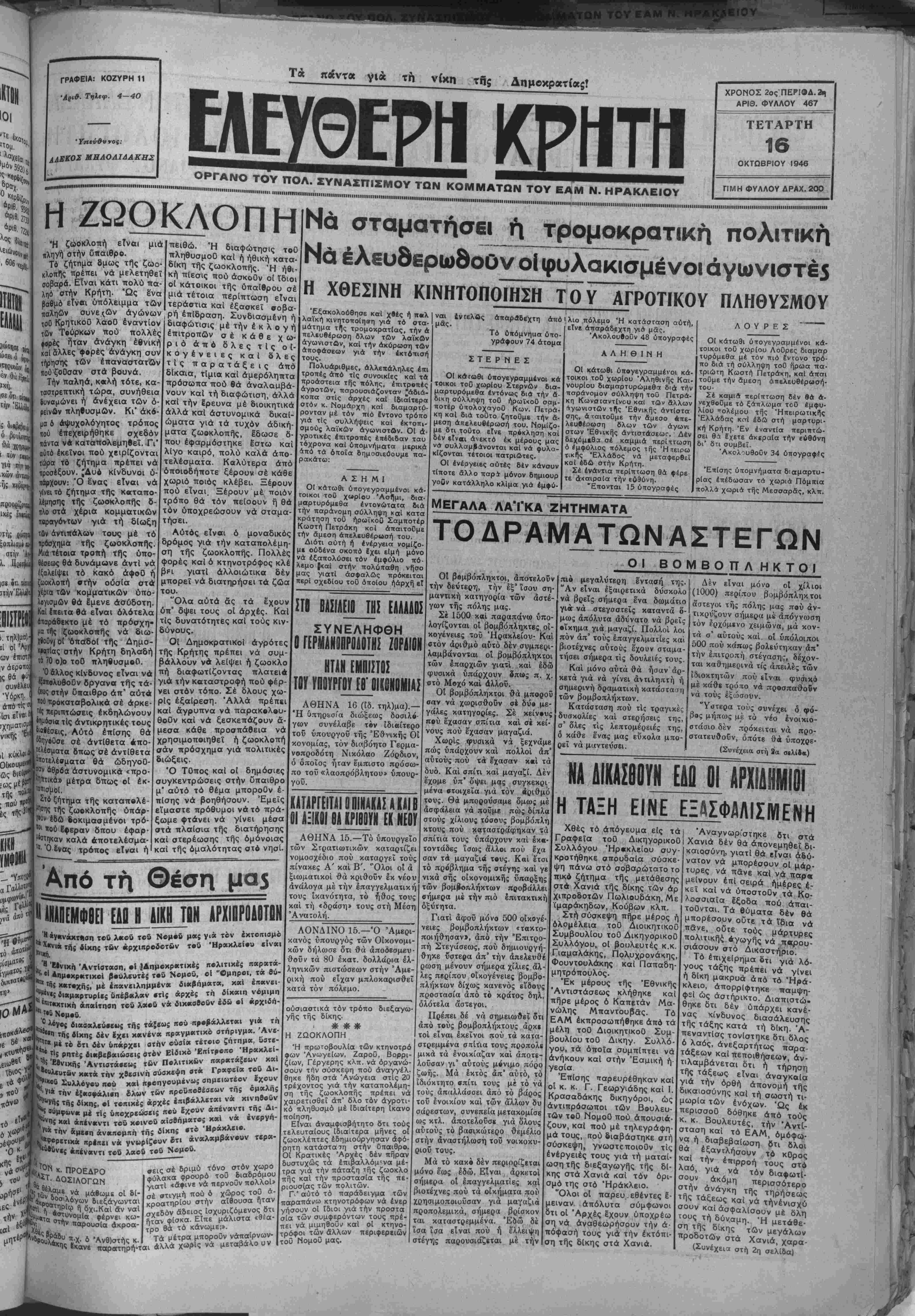 ·»Λ -_____ η ·> , < . ηΐ/. ί[.|.,_χ 'ΔΙΙΑ ^·~Α·__. ματημα της τρομοχρατίας, την ά ττελϊυθέρωση δλων των λαϊκων άγωνιστθν, καί την άκύρωση τΛν αττοφασεων γιά την ίκτότιισή τους. Πολυάριθμες, Αλλεπάληλες επι τροπές άπό τίς συνοικΐες καί τα ιτροάστεια τής πόλης, έττιτροπίς άγροτων, παρουσιάζοντα^ ^άδιά- κοπα στίς άρχές καί Ιδιαιτέρα στόν κ. Νομάρχη καί διαμαρτύ- ρονταν μέ τόν πιό Εντονο τρόπο γιά τίς συλλήψεις καϊ έκτοπι- σμούς λαϊκών άγωνιστθν. ΟΙ ά γροτικές έττιτροπές έπέδιδαν ταυ τόχρονα καί ύπομνήματα μκρικά άπό τΛ όηοΐα δημοσιεΰουμε πα- ρακάτω: ΑΣΗΜΙ Οί κάτωθι ύπογεγραμμένοι κα- τοικοι τοθ χωρίου Άσ1μι, δια- μαρτυρόμεθα έντονώτατα διά την παράνομη σύλληψη καί κστα κρατήση τοό ήρωϊκοθ Σαμποτέρ Κωστή Πετράκη κοί άπαιτοθμε την δμεση άπελβυθέρωσή τού. Διότι αυτή ή ενεργεια νομίζο- μι ουδένα σκοπώ έχει ειμή μόνο νά έζαπολύσει τόν έμψύλιο πό- λεμο (καΐ στήν πολύπαθη νήσο μας γιοτί ασφαλώς πρόκειται περϊ σχεδίου τοθ όποίου ήάρχή εΤ 4παραδε-χτη άπό ι λιο πόλεμο Ή κατασταση αυτή Τό ύπόμνηασ ύτο- γράφουν 74 άτομα ΣΤΕ Ρ Ν Ε Σ ΟΙ κάτωθι ύιτογεγραμμένοι κά τοικοι τοθ χωρίου Στερνών δια- μαρτυρόμεθα εντόνως δια την α- δικη σύλληψη τοθ ήρωϊκοθ σσμ- ποτέρ ύπολοχαγοθ Κων. Πετρά¬ κη καΐ διά τοθτο ζητοθμβ την &- μεση άπελευθέρωσή τού. Νομίζο- με δτι τοθτο είνε προκληθή καί δέν είναι άνεκτό έκ μέρους μας νά συλλαμεάνονται καΐ νά φυλα- κίζονται τέτοιοι πατριωτες. Οί ένέργειες αϋτές δέν κάνουν τίποτε αλλο πσρΛ μόνον δημιουρ γοθν κατάλληλο κλίμα γιά έμφυ- εΐνε άπαράδεχτη γιά μδξ. Άκολουβοθν 48 ϋπογραφές ΑΛΗΘΙΝΗ ΟΙ κάτωθι ύπογεγραμμένοι κά¬ τοικοι τοθ χωρίου Άληθινής Και¬ νουρίου διαμαρτυρώμεθοΐ διά την παράνομον σύλληψη τού Πετρά¬ κη Κωνσταντίνου καί των αλλων *γωνιστών τής Έθνικής άντίστα σης, ά ταιτοΰμε την αμεσο ώπε- λευβέρωση δλων των άγωνι οτων Έθνικής άντιστάσεωΓ. Δέν δεχόμΐθα σέ καμμιά περίατωση ό ίμφύλιος πόλεμος τής Ή τειρω τικής Ελλάδος νά μεταφερθεΐ καΐ έδώ στήν Κρήτη. Σέ ένάντια περίπτωση θά φέρε τε άκαιραία την εθθύνη. "Επονται 15 Οηογραφές «0 προκαταβολικά σέ άρκε- Τ*5 «εριπτώσεις έκδηλώνουν •ΐμώσια τίς άντικρητικές τους «βίέσεις. Αύτό έπίσης θά δδηγβθσε σέ άντίθετα απο- ΐελέσματα όπως σέ άντίθετα |«οτελέβματα θά ώδηγοθ- ιον οθρόα άστυνομικά «προ- ίηπτικώ» μέτρα δπως οί έκ- |ΐοπισμο(. ^ο ζήτημα τής καταπβλέ- "Ίξ της ζωβκλοπής ύπάρ- "ν έδω δοκιμασμένοι τρό- 1 Κου Ιψεραν δπου έφαρ- «ηκαν καλά αποτελέσμα- • Ό ενας τρόπος είναι ή ρίς έξαίρεση. Άλλά πρέπει καί άγρυπνα νά παρακολβυ- θοθν καί νά ξεσκεπάζουν ά- μεσα κάθε προσπαθεία νά χρησιμοπβιηθεΐ ή ζωοκλοπή σάν πρόσχημσ γιά πολιτικάς διώξεις. Ό ΤΟπος καί οί δημόσιες συγκεντρώσεις στήν υπαιθρο μ' αύτό τό θέμα μποροθν έ¬ πίσης νά βοηθήσουν. "Εμείς εί'μαστε πρόθυμοι νάτό πρά- ξωμε φτάνει νά γίνει μέσα στά πλαίσια τής διατήρησης καΐ στερέωσης τής όμόνοιας καί τής ομαλότητος οτό νησΐ- ^Πό τη Θέση μα.5 |1Ϊ1ΙΕΗΦΙΕΙ ΗΟ Η ΛΈΗ Τ8Η ΑΡΧΙΡΡΟΑΟΤΒΗ *-*ν«νάχτΐιση τβθ λκοΰ τβθ Νομ·» μ«ς γ»« τβν έκτβπιομβ ΣΤ! ΒΑΣΙΛΕΙΟ___ΤΗΣ ΕΑΑΑΔΟΣ ΣΥΝΕΛΗΦΘΗ Ο ΓΕΡλΙΑΝΟΠΡΟΔΟΤΗΣ ΖΟΡΔΙΟΝ ΗΤΑΝ ΕΜΠΙ.ΤΟ. ΤΟΥ ΥΠΩΥΡΓΟΥ ΕΒ' ΒΙΙΟΝΡΜΙΑΣ ΑΘΗΝΑ 16 (ϊδ. τηλ)μα).— "Η Οπηρϊσία διώξεως δοσιλν γων συνέλαβε τ·ν ίδιαίτερο τοϋ ύπουργοϋ τής Έθνικής Οϊ κονομίας, τόν διαβόητο Γερμα- νοπροδότη Νικόλαο Ζόρδιον, ό οποίος ήταν έ'μπιστο πρόσω- πο τοΰ «λαοπρόβλητου» ύπουρ- γοθ. ΜΕΓΑΛΑ ΛΑ'Ι'ΚΑ ΖΗΤΗΜΑΤΑ Λ Ο Υ Ρ Ε Σ -~— Οί κάτωθι ύττογεγραμμίνοι κά¬ τοικοι τοθ χωρίου Λοϋρες δισμαρ τυρόμεθα μέ τόν πιό Ε